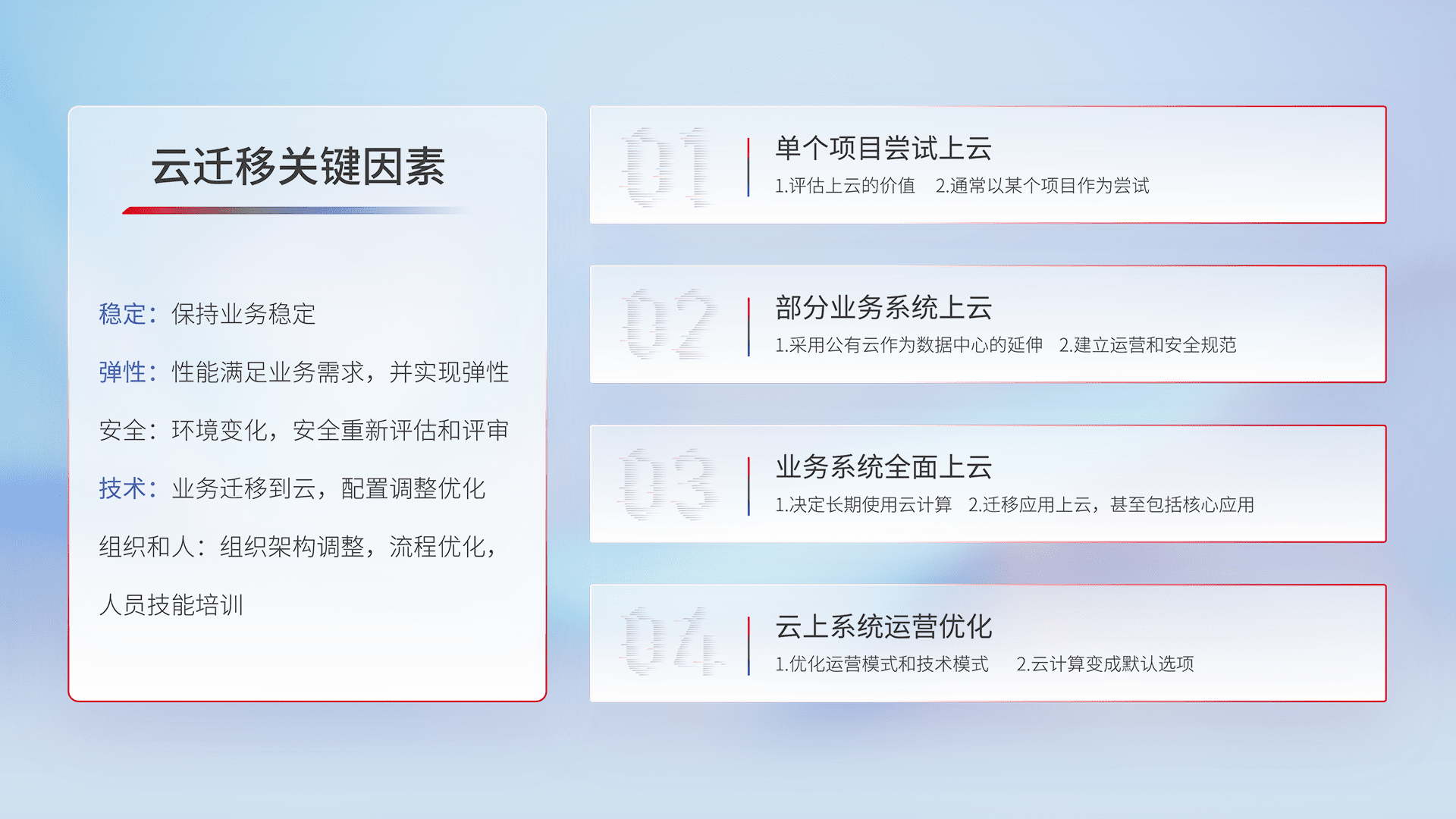 结合实际业务,,从规划设计、、、云平台选型、、、云原生改造、、数据迁移、、集成交付,,,,迁移全过程为客户识别最佳上云路径,,做好风险识别管理,,,设计网络架构、、身份权限、、安全审计合规、、、操作审计、、、日志审计、、监控告警策略、、多站点容灾设计等,,对云上基础设施进行整体规划,,,提升IT治理水平,,以满足弹性、、、高可用、、高性能的需求。。