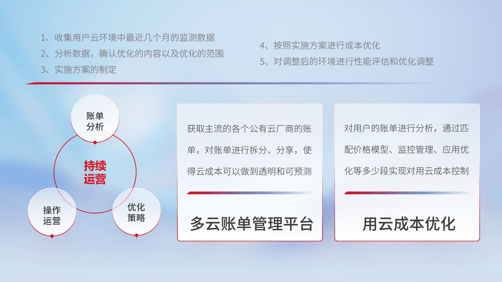 通过多云纳管,,,以统一的资源数据模型把客户的云资源进行抽象和封装,,,进而实现对多云资源的统一操作,,保障云资源管理的可靠性、、稳定性与可用性。。量身定制化运维内容,,配置、、、、开发运维、、、、补丁管理、、、备份、、、监控、、、、认证和访问管理、、、审计和日常巡检等,,,,保障在用云过程中的可靠度,,稳定度以及高可用率。。。